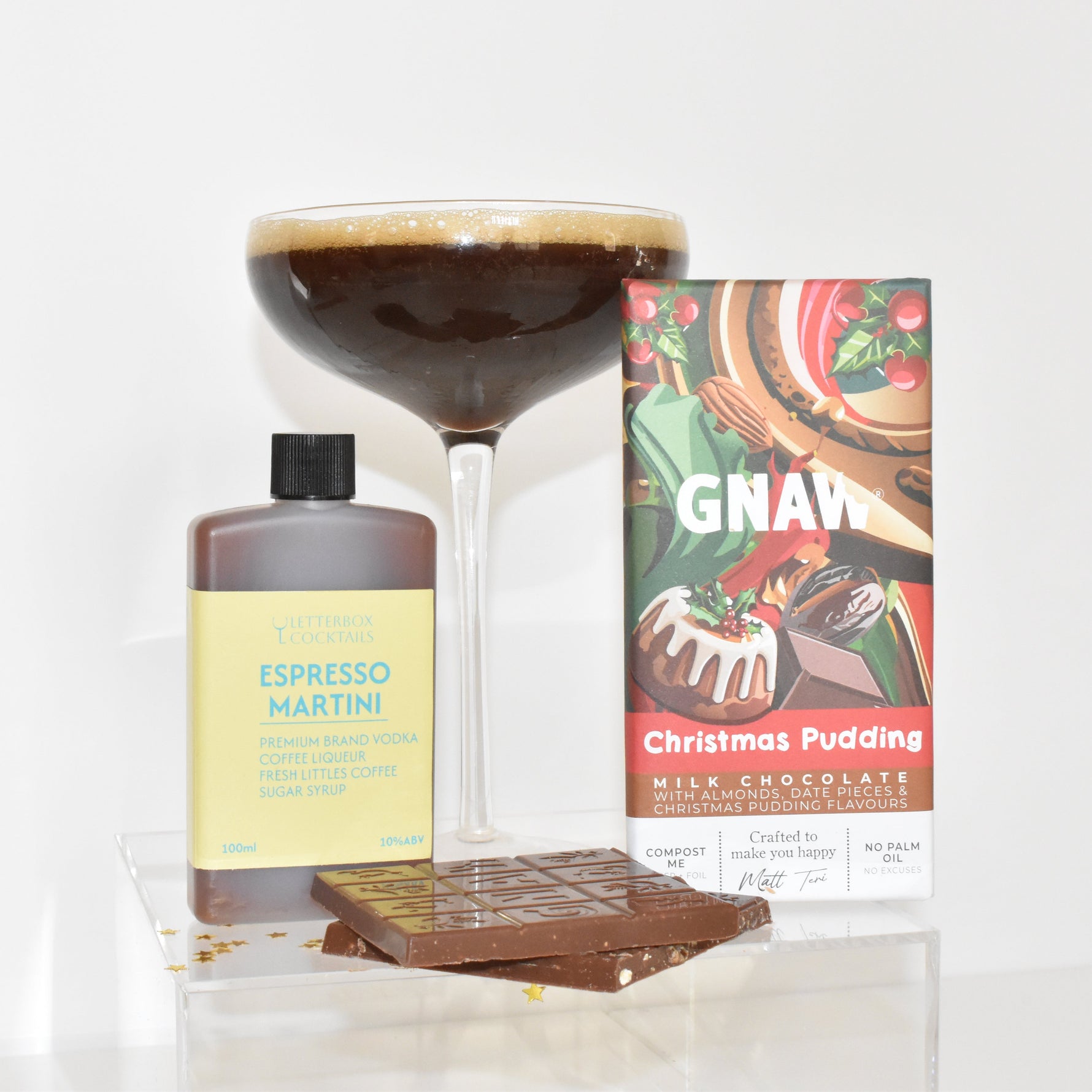 Choose any mini cocktail or mocktail to accompany a Gnaw Christmas Pudding chocolate bar